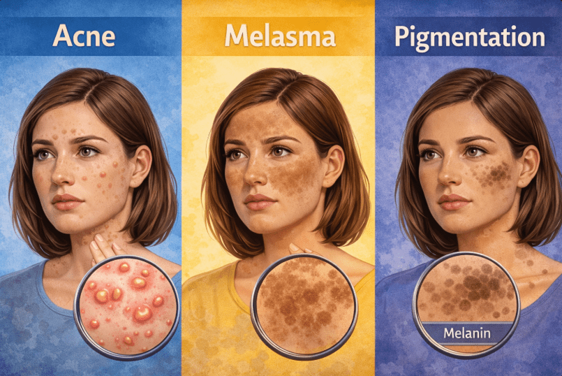 Skin concerns such as acne, melasma, and pigmentation are extremely common, yet they are often misidentified or grouped together. While these conditions may appear similar on the surface, they differ significantly in cause, appearance, and management.